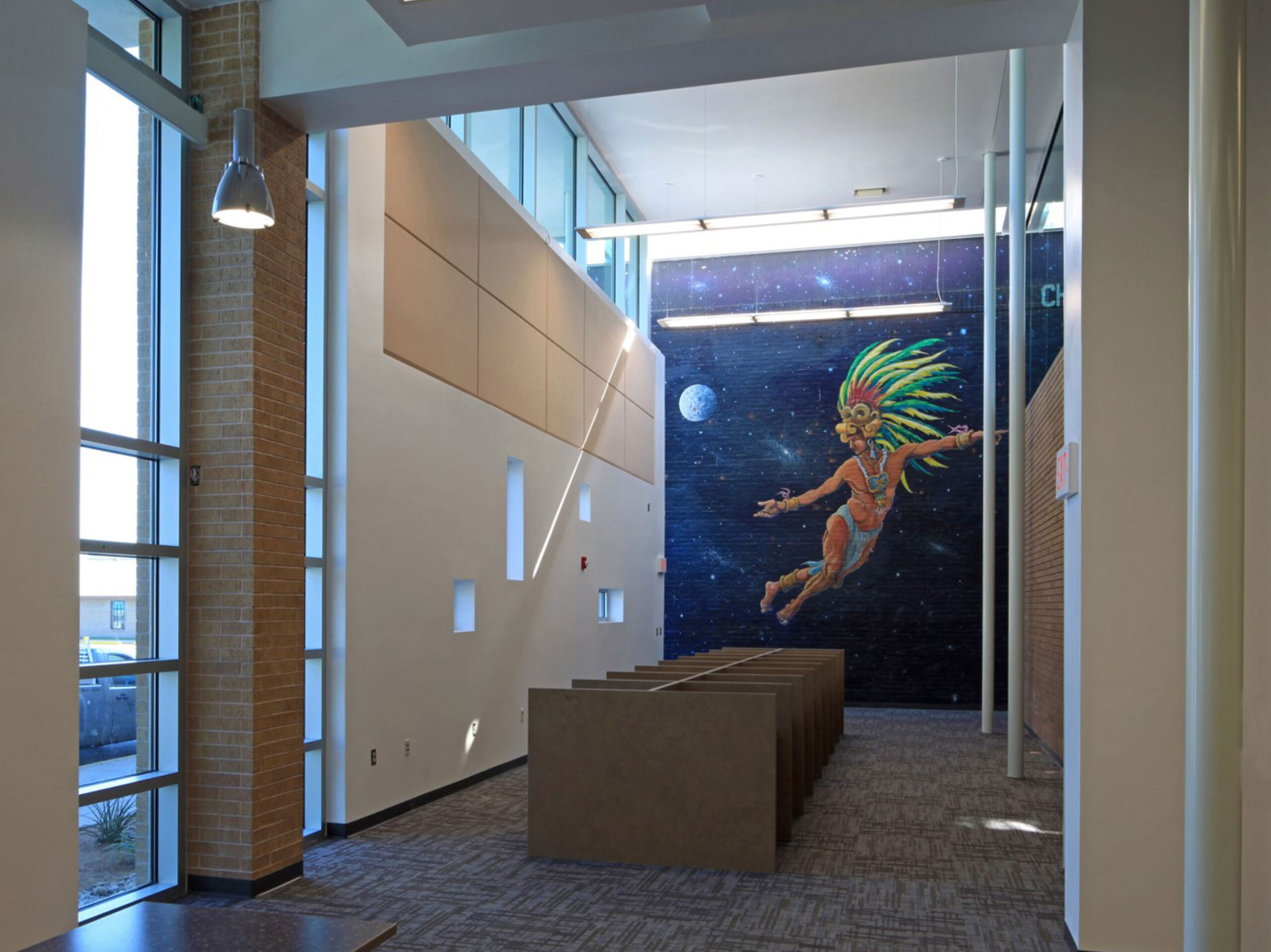 The Armijo branch library is a symbolic building to the “Segundo Barrio” a low income , predominantly Hispanic community. The addition kept the autonomous Carnagie design while preserving, protecting the iconic mural of the “Aztec Warrior” while maintaining a prominent view through the large transparent glazing. It was necessary for the new addition to relate to the existing building by maintaining the existing design while adding a new view and design. By incorporating the existing structure masses, size and proportions, colors, textures, and materials, the design team was able to accommodate and maintain a seamless transition from the original facade to the new addition.